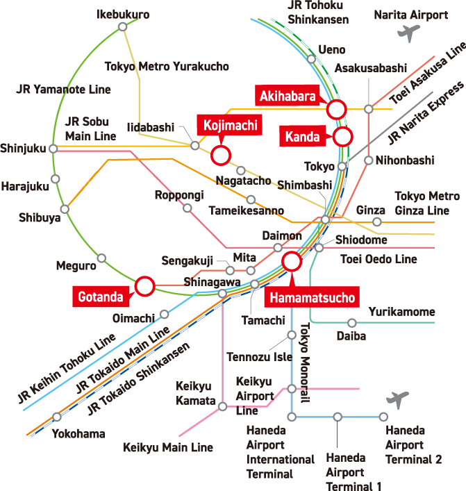 Five locations in central Tokyo are located within a 1 to 4-minute walk from the nearest station. Multiple train lines are available providing a good public transport network.